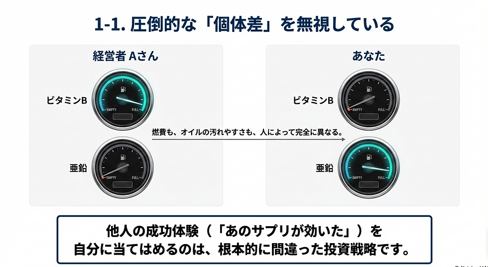 私たちの身体は車と同じで、人によって燃費も違えばオイルの汚れやすさ、酷使しているパーツも異なります。Aさんにとって奇跡のように効果があった「ビタミンB群」も、Bさんにとってはすでに充分満ちており、不足しているのは「亜鉛」かもしれません。「あの人が良いと言っていたから」という他人の成功体験をそのまま自分に当てはめるのは、根本的に間違っています。