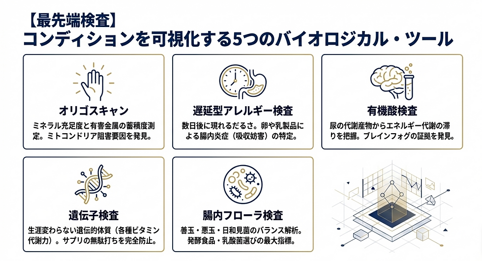 まずはご自宅で簡単に尿でわかる「栄養解析」や、「遺伝子検査」「腸内フローラ検査」などを活用し、大まかな傾向や現在のリスクを可視化することが可能です。そして「もっと自分の体内や細胞レベルで深いデータを知り、根本からアプローチしたい」という方には、提携クリニックと連携した詳細な血液検査から最先端の「バイオロジカル検査」まで、医療と連動した本格的なご案内も行っています。